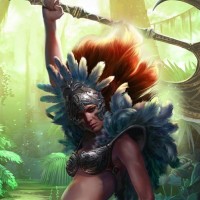 particular character appears to be an assassin, as indicated by her attire and accessories such as the leather and feather outfit, bracers on her arms, a belt with pouches, and the hood that seems to be part of her gear for stealth and protection. The setting looks like a dense