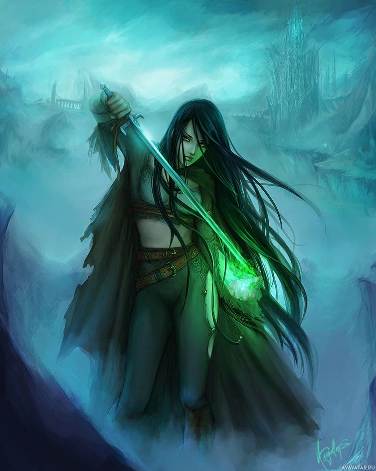 fantasy character, who appears to be a warrior or an elf. She is depicted in profile with a determined expression, holding a sword and a bow. Her hair is long and dark, which suggests she might have