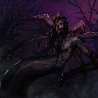 a forest at night, illuminated by dark purple hues that create a sinister atmosphere. The overall mood of the picture seems eerie and unsettling, fitting for the horror or monster genre.