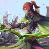 fantasy armor and holding a bow, suggesting she might be a ranger or archer-type class within the game. Her attire includes green and brown elements, with what appears to be a cape flowing behind her, adding to her dynamic and heroic appearance. The setting looks like a forest with