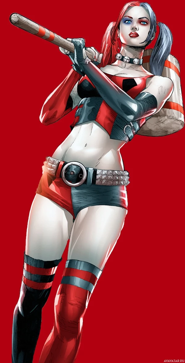 Harley Quinn, a character from the DC Comics universe. She is depicted in her iconic red and black outfit, holding