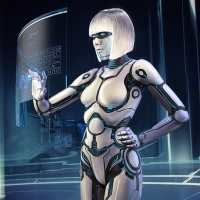 a humanoid robot standing in what appears to be a futuristic or cyberpunk setting. The robot has a sleek,
