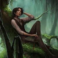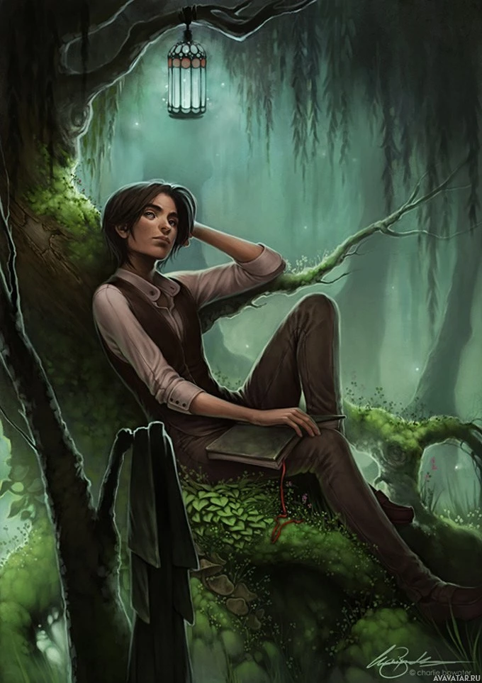 The image depicts a person sitting on a mossy branch in what appears to be a mystical or enchanted