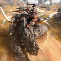 a fantasy scene with an orc riding a large, menacing creature that resembles a bull with sharp teeth. There is also