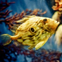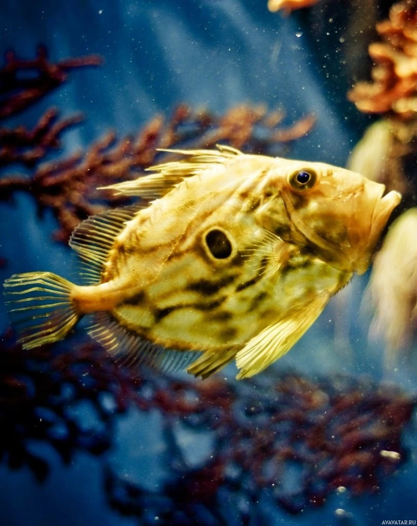 На снимке изображена рыба-пухоль в аквариуме. Рыбы пуффер известны своей отличительной формой тела и поведением, в том числе способностью надувать себя воздухом или водой, когда они чувствуют угрозу. Они принадлежат к семейству Tetraodontidae и встречаются в морской среде.