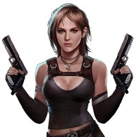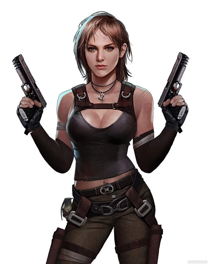 На картинке изображен женский персонаж с короткими каштановыми волосами, одетый в жилет и кобуру с несколькими пистолетами. Она стоит в позе, которая предполагает, что она готова к бою или действию. Ее выражение серьезное.