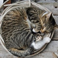 a circular shape that resembles a basket or a hammock. One of the kittens is on top, while the other is underneath, creating an appearance of them sleeping back-to-back. The background shows