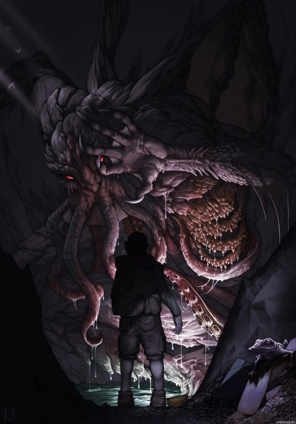 a fantasy scene featuring what appears to be a creature from the Cthulhu mythos. In the center, there's a large