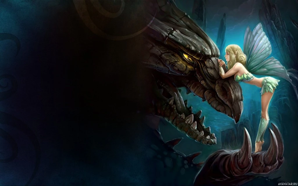 The image shows a fantasy-themed illustration with a dragon and a fairy. The dragon appears to be fierce, with