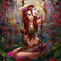 red hair and is adorned with plants, further emphasizing the theme of nature. The overall impression is one of fantasy and