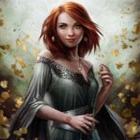На картинке изображен женский персонаж с рыжими волосами, одетый в платье. У нее элегантная и вдохновленная фэнтези внешность. На заднем плане разбросаны желтые листья, предполагая, что это может быть осень или обстановка с волшебной темой.