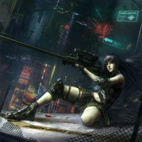 tactical gear, including armor and a utility belt, and is holding a sniper rifle. Her stance and the position of her hands suggest she is either preparing to fire or has just fired the weapon. The background appears to be