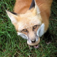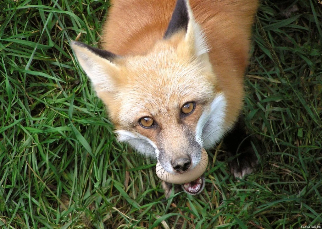 На картинке изображена рыжая лиса. Кажется, что она держит во рту какой-то предмет, который, похоже, может быть какой-то пищей, возможно, яйцом или небольшим кусочком мяса.