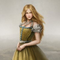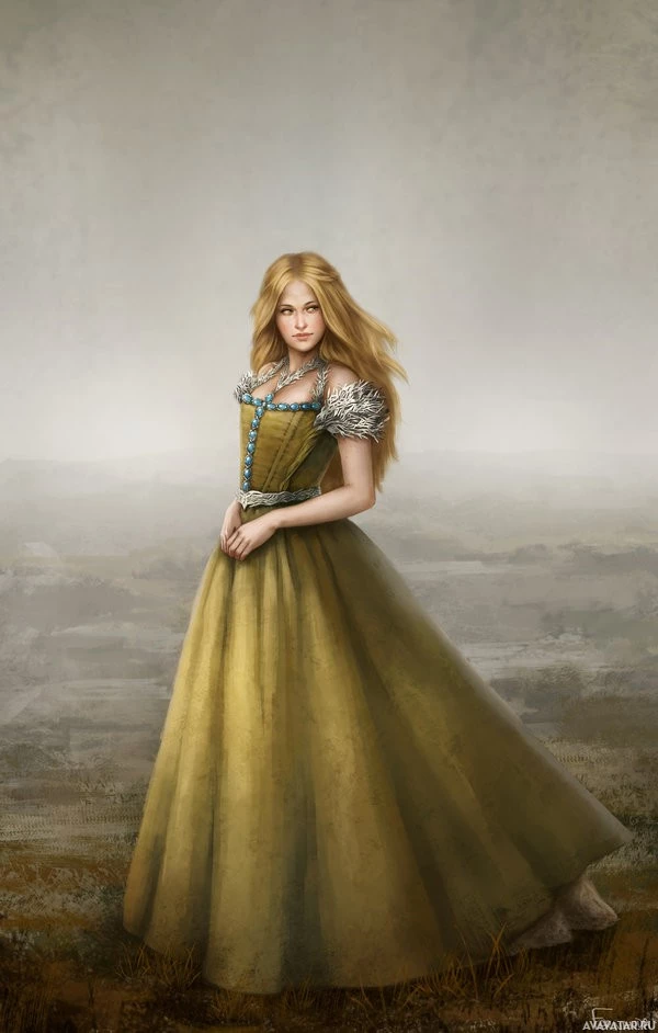 a natural environment that appears to be a field or meadow with some vegetation and a body of water in the background. Her gaze is directed towards something outside the frame, giving her an introspective or contemplative look. The overall style of the painting suggests it could be from a historical or fantasy-themed genre.
