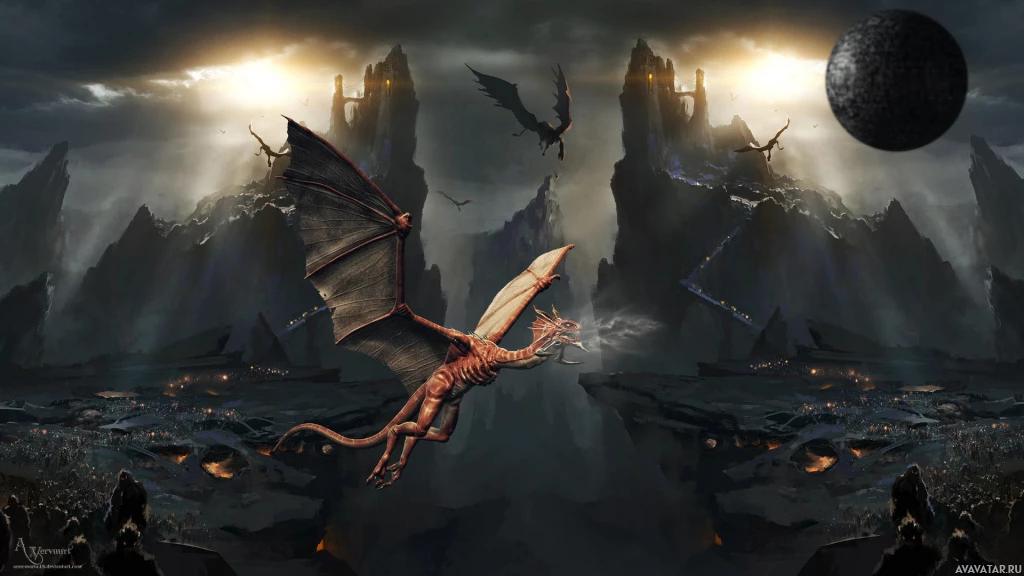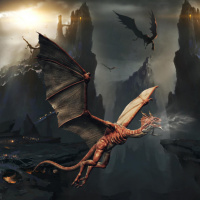 mythical creature flying through the air, with its wings spread wide and tail extended behind it. In the background, there are dark, ominous-looking rocks or formations under what seems like