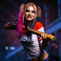 Quinn costume from the Batman franchise. They are wearing a jester-like outfit with