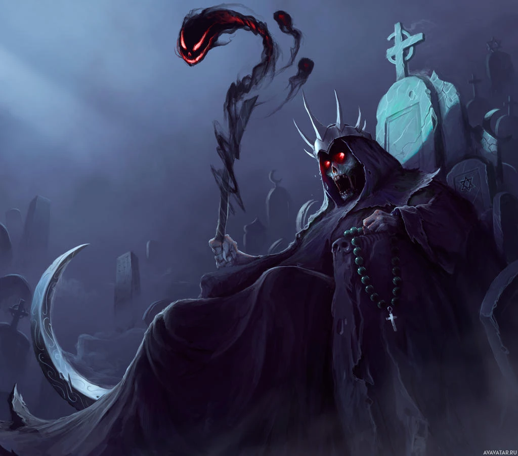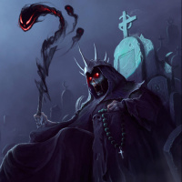 an evil presence. He is holding what looks like a staff or wand adorned with skulls or bones. The setting seems to be a graveyard at nighttime, as indicated by the darkness and the graves in the background. There's a cryptic cross symbol visible on the gravestones, which adds to
