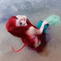 a cosplay costume, portraying the character of Ariel from "The Little Mermaid." They are sitting on