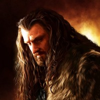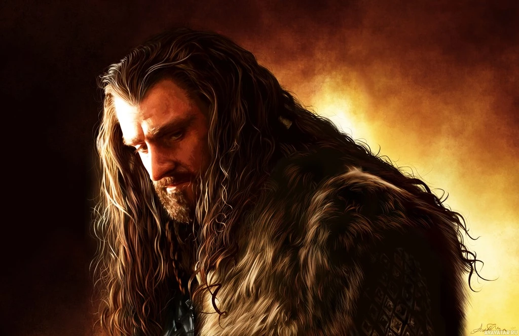 long hair and a fur cloak, which are characteristic features often associated with dwarves in fantasy literature and adaptations. This character is likely someone significant within the narrative, given the solemn and contemplative pose.
