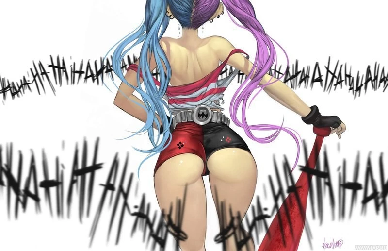 Harley Quinn's appearance in the DC Comics universe. The background has text that appears to be a sound effect or noise, indicating that the character may be making some sort of commotion or expressing excitement, but without additional context, it is not possible to determine