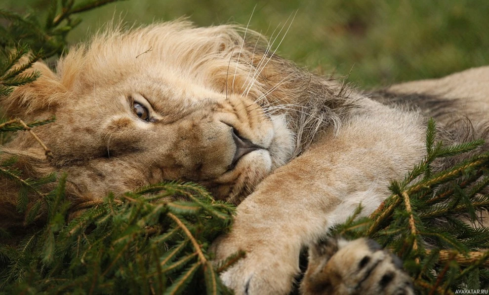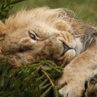 The image shows a lion lying down with its eyes closed, resting its head on one paw. It appears to be in a calm and relaxed state. The lion is surrounded by some greenery, possibly foliage or bushes, which suggests it might be in