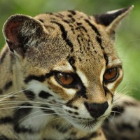 The image features a young leopard cub. It has distinctive spotted fur, which is characteristic of its species. The cub appears to be in a natural setting with vegetation in the background, suggesting that it might be in a wildlife reserve or similar habitat.