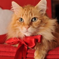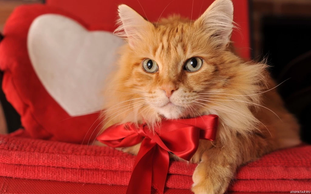a red bow around its neck and appears to be sitting on a red cushion or chair. In the background, there's a heart-
