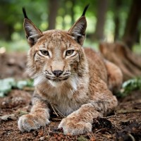 a wild cat known for its distinctive ear tufts and reflective eyes. The lynx appears to be in the woods or brush, resting with a calm expression, perhaps observing something or simply enjoying