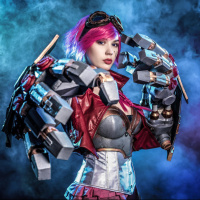 mechanical components integrated into their attire, which are part of Vi's signature look. The background suggests a promotional or event-related setting with dramatic