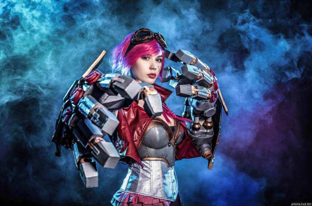 The image shows a person dressed in cosplay, portraying the character Vi from "