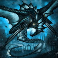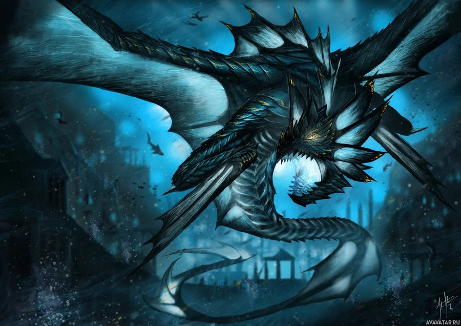 large wings, scales, and a fearsome expression on its face. The background suggests an underwater or submerged environment with ruins or structures that could be from