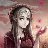 a dark top that has a deep V-neckline and appears to be a cape, which adds to her elven appearance. There are butterflies fluttering in the air near her hand, adding a touch of whimsy to the scene. The overall atmosphere of the image is serene and magical, fitting within the genre of fantasy art.