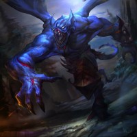 a mythical creature known as a demon, with blue skin and wings. It has sharp teeth and is shown in