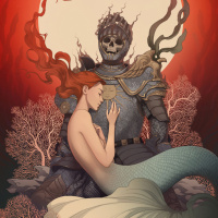 a fantasy scene with two characters. On the left side, there is a figure that appears to be a red-haired mermaid sitting on a branch or