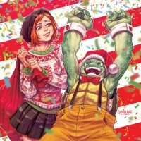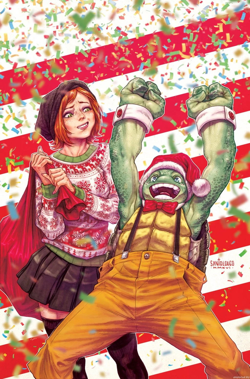 a festive season. They are surrounded by confetti, indicating that they might be at a party or event. The art style suggests it's a comic book illustration.