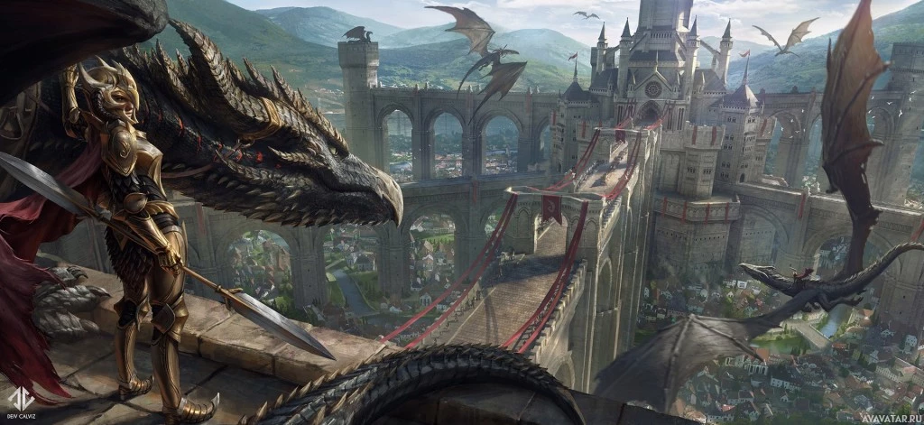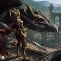 a fantasy scene featuring a character that appears to be a dragon rider or a warrior with a dragon-like armor. They are standing on what seems to be a bridge or platform with a castle or city in the background. There are also elements of nature like trees and hills around the structure, suggesting this could be a scene from