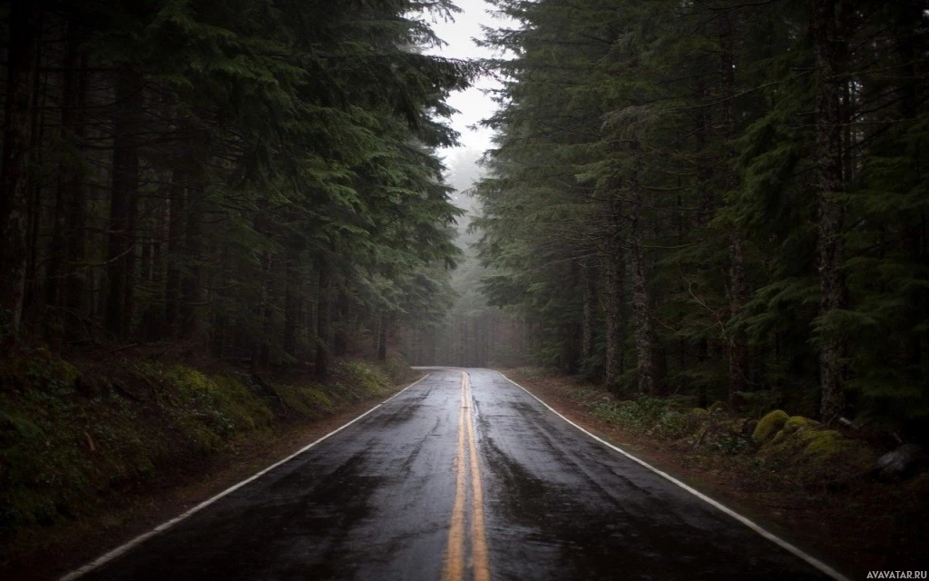 the slick surface of the road and the moisture in the air. There are trees on both sides of the road, which is a two-lane highway. The sky is overcast with gray clouds, adding to