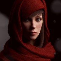 The image features a female character, likely from a video game or a piece of digital art. She is wearing a red hooded cloak, and her expression appears serious or contemplative as she gazes to the side. Her attire suggests she might be part of a fantasy or historical setting. The overall atmosphere of the image conveys a sense of mystery and intrigue.