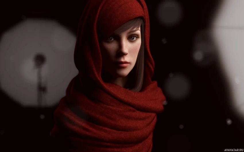 На картинке изображен женский персонаж, вероятно, из видеоигры или произведения цифрового искусства. Она носит красный плащ с капюшоном, и ее выражение кажется серьезным или созерцательным, когда она смотрит в сторону. Ее одежда предполагает, что она может быть частью фантазии или исторической обстановки. Общая атмосфера изображения передает ощущение таинственности и интриги.