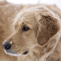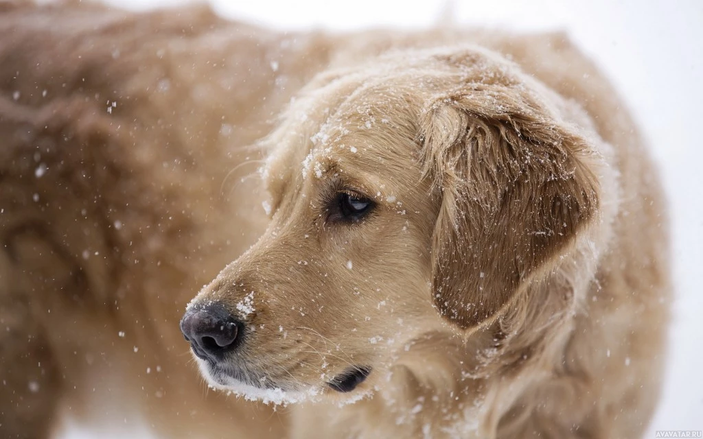 На снимке изображена золотая собака-ретривер с покрытым снегом мехом. Глаза собаки закрыты, что придает ей очаровательное и безмятежное выражение. Похоже, он смотрит вверх.