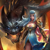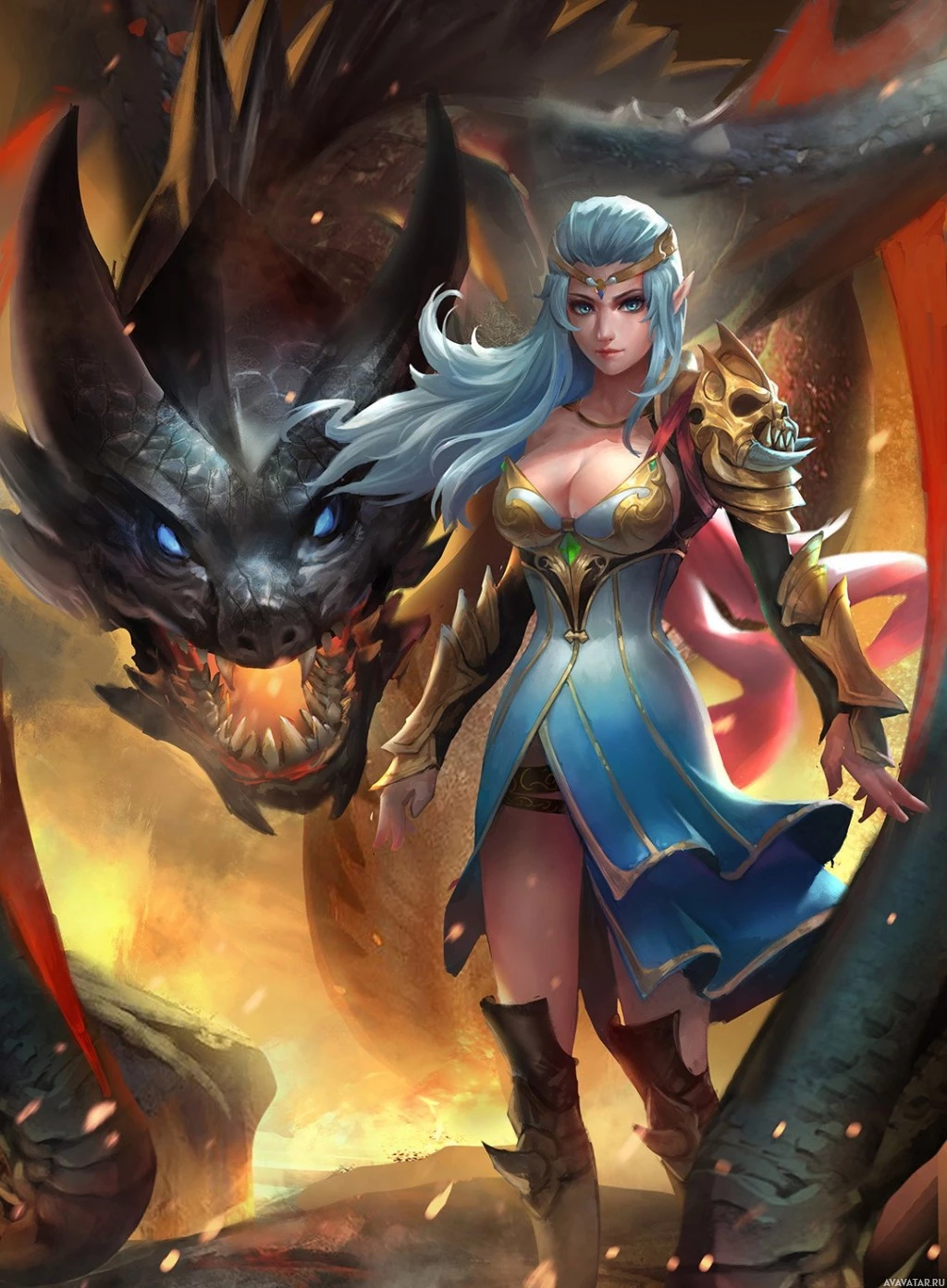 blue hair and is wearing a fantasy armor with some gold accents, suggesting she may be a warrior or a heroine in this setting. To her side, there's a dragon with a fierce appearance, possibly indicating conflict or confrontation between the two characters. The background suggests an intense