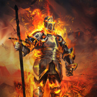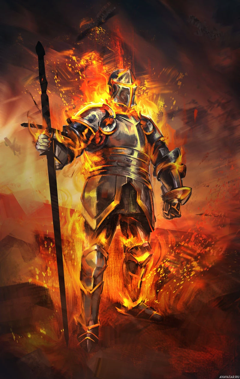 a dramatic sky, possibly indicating a battlefield or a scene of great conflict. Surrounding the warrior are flames that add to the overall