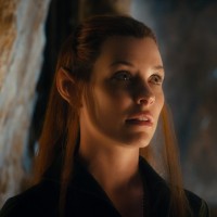 This image features an actress portraying a character from the movie "The Hobbit: The Battle of Five Armies." She is dressed in costume that resembles the Elves of Middle-earth, and her expression appears to be one of concern or serious thought.