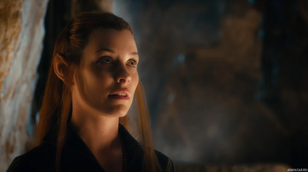 На этом изображении актриса изображает персонажа из фильма «Хоббит: Битва пяти армий». Она одета в костюм, напоминающий эльфов Средиземья, и ее выражение, кажется, вызывает беспокойство или серьезную мысль.