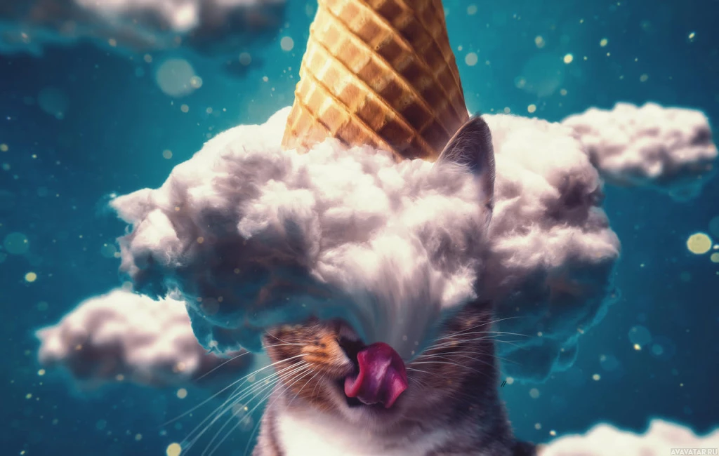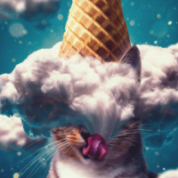 an ice cream cone, giving the impression that the cloud has been transformed into an edible treat for the cat. This playful and surreal composition includes a vibrant background with more clouds and stars, enhancing