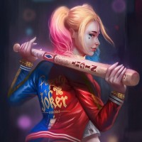 a baseball bat over her shoulder and wearing her iconic red and blue costume with the Joker logo on it. Her pose suggests she is ready for action. The artwork showcases a high level of detail and