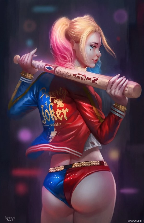 Harley Quinn, a character from the DC Comics universe. She is depicted holding