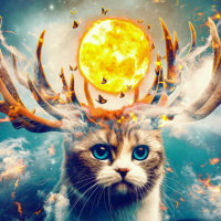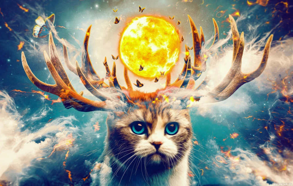 deer antlers on its head. The background is vibrant and dynamic, depicting clouds and flames that give the impression of an explosion or
