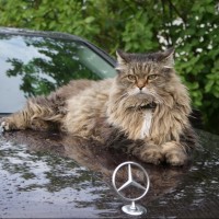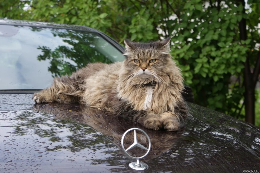 long fur and a distinctive expression that seems to indicate it might be in a state of displeasure or annoyance. The car appears to be a Mercedes, as indicated by the logo at
