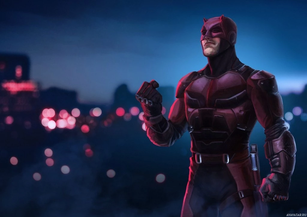 The image shows a stylized depiction of the character Daredevil, who is known for his appearances in various